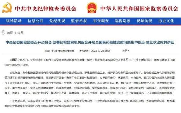 另?yè)?jù)中央紀(jì)委國(guó)家監(jiān)委網(wǎng)站消息,7月28日,紀(jì)檢監(jiān)察機(jī)關(guān)配合開(kāi)展全國(guó)醫(yī)藥領(lǐng)域腐敗問(wèn)題集中整治工作動(dòng)員部署視頻會(huì)議召開(kāi)。