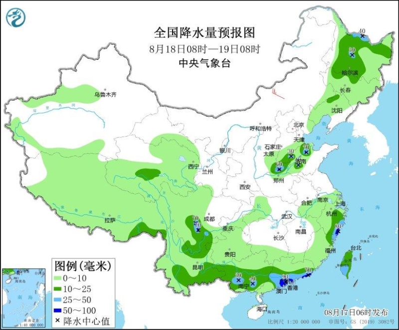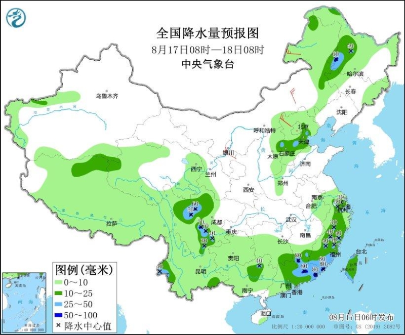 8月17日08時(shí)至18日08時(shí),內(nèi)蒙古東北部、黑龍江西部、吉林西部、天津、河北中部、山西東部、川西高原中北部、四川盆地西南部、云南西部和東北部、廣西中北部、廣東中東部、湖南東南部、江西南部、福建、浙江大部、江蘇南部、上海西部、臺(tái)灣島等地的部分地區(qū)有中到大雨,局地有暴雨(50~80毫米)。內(nèi)蒙古中部、河北北部等地的部分地區(qū)有4~6級(jí)風(fēng)(見(jiàn)圖1)。