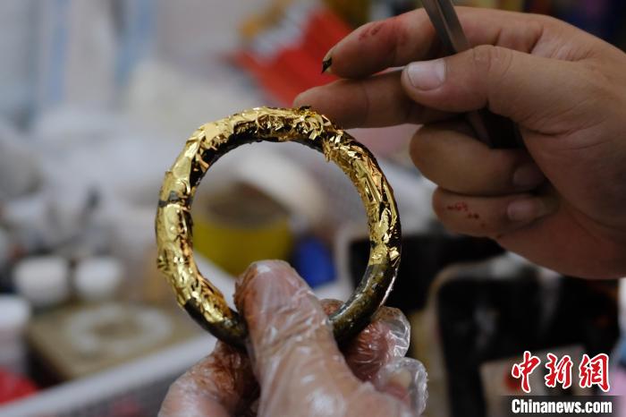 圖為溫云鵬正在給手鐲貼上金箔紙。劉俊聰 攝