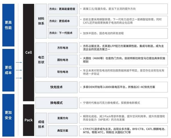 材料從根本上決定著電池性能。通過(guò)改進(jìn)材料提高電池性能、優(yōu)化電池老化機(jī)制、應(yīng)用新型材料、改變電芯結(jié)構(gòu)是電芯研發(fā)的主要方向。例如,材料體系方面,采用新型材料體系(高鎳正極、硅基負(fù)極、鋰金屬負(fù)極、固態(tài)電解質(zhì)等),提高單體能量密度;或者研制出磷酸錳鐵鋰,探索鈉離子電池的商業(yè)化應(yīng)用,降低成本;或者加快固態(tài)電池的研發(fā)進(jìn)程,使電池性能更高,更耐久。電芯形狀方面,方形電池,尤其是LFP短刀兼顧性能、集成與制造,成為主流企業(yè)的優(yōu)選方案之一;大圓柱電池也是熱門方向,特斯拉和寶馬均已提出具體的實(shí)施規(guī)劃??斐浼夹g(shù)方面,多家主機(jī)廠開始導(dǎo)入800V高電壓平臺(tái),并聯(lián)合電池企業(yè)推出2C~4C快充方案。