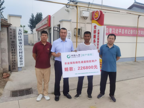 在天津市寶坻區(qū),受連日暴雨影響,當(dāng)?shù)厮敬竺娣e被淹,農(nóng)戶損失巨大,國(guó)壽財(cái)險(xiǎn)天津市分公司成立了大災(zāi)應(yīng)急查勘小組,開通農(nóng)險(xiǎn)綠色理賠服務(wù)通道,為當(dāng)?shù)卮筇魄f鎮(zhèn)狼爾窩村、董官莊村出險(xiǎn)農(nóng)戶提供高效的理賠服務(wù),第一時(shí)間支付賠款合計(jì)約38萬元,給受災(zāi)農(nóng)戶吃了一顆定心丸?!氨┯陝偼?,理賠人員就過來了,報(bào)案還不到24小時(shí),20多萬賠款就到賬了,中國(guó)人壽的理賠服務(wù)真是太給力了!”收到保險(xiǎn)賠款的種植戶馬先生難掩激動(dòng)之情。
