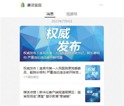 7月6日,“廉潔宜賓”發(fā)布消息,宜賓市第一人民醫(yī)院原黨委書記、院長謝明均嚴(yán)重違紀(jì)違法被開除黨籍;宜賓市第一人民醫(yī)院原黨委委員、副院長楊利嚴(yán)重違紀(jì)違法被開除黨籍和公職。