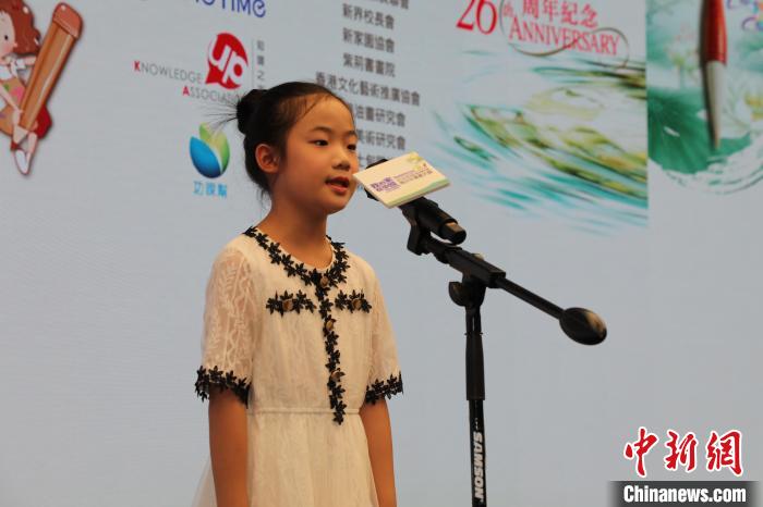 第七屆“紫荊杯”兩岸暨港澳青少年書畫大賽頒獎(jiǎng)典禮8月17日在香港舉辦。圖為幼兒書法組金獎(jiǎng)得主曾姝彤分享獲獎(jiǎng)感言。紫荊雜志社供圖