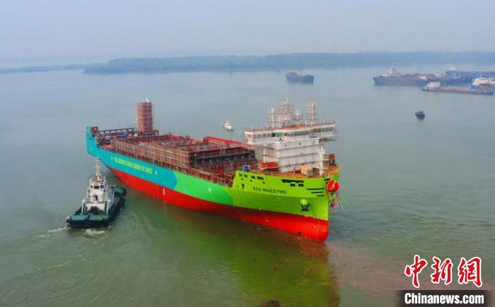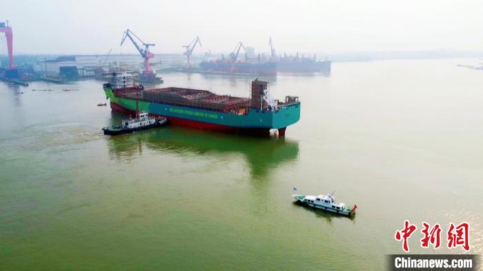 中國首艘小型甲醇雙燃料集裝箱船在揚州下水。揚州海事局供圖
