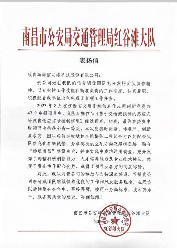 8月4日,南昌市公安局交通管理局紅谷灘大隊發(fā)來表揚信。信中對海信信號調(diào)優(yōu)團隊專業(yè)的工作技能和高度負責(zé)的工作態(tài)度予以表揚,尤其提到海信團隊“充分發(fā)揮了海信科研創(chuàng)新能力、人才培養(yǎng)能力及專業(yè)技術(shù)特長,體現(xiàn)了警企協(xié)作配合優(yōu)勢,贏得了領(lǐng)導(dǎo)及各方的高度稱贊?!?/p>