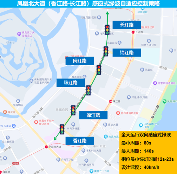 模型投入實戰(zhàn)應(yīng)用后效果顯著。以紅谷灘區(qū)鳳凰北大道(香江路-長江路)為例,路段全長1.8km,沿途共6個信號燈控路口,流量波動性大。原先定周期協(xié)調(diào)方案消耗1人工一個月持續(xù)監(jiān)測優(yōu)化,效果不能適應(yīng)流量變化,存在不定時性主路擁堵而支路空放的失衡問題。通過復(fù)用已建設(shè)的流量檢測器,數(shù)據(jù)賦能只需1人工1天時間配置感應(yīng)式綠波自適應(yīng)方案基礎(chǔ)參數(shù),信號周期及各相位綠信比隨著流量變化自動調(diào)整方案,大幅提升效率并保障效果。