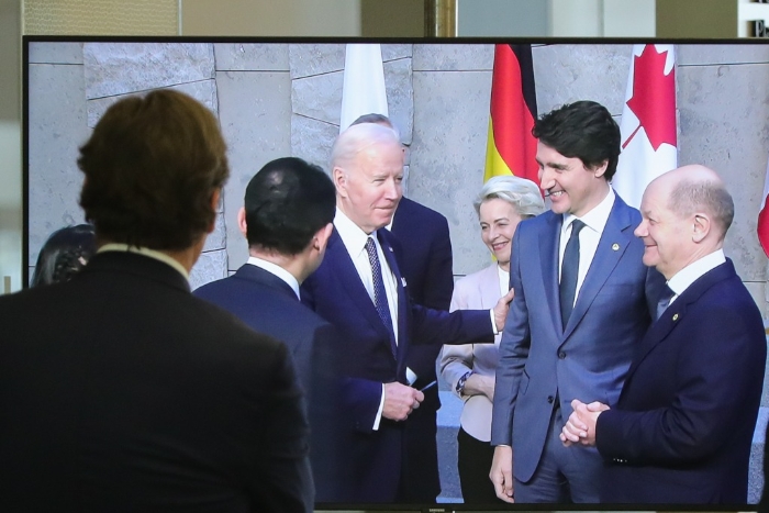 2022年3月24日,在比利時(shí)布魯塞爾的北約總部,一名男子觀看屏幕上美國(guó)總統(tǒng)拜登(右四)、歐盟委員會(huì)主席馮德萊恩(右三)、加拿大總理特魯多(右二)、德國(guó)總理朔爾茨(右一)出席七國(guó)集團(tuán)峰會(huì)合影儀式的畫面。新華社記者鄭煥松攝