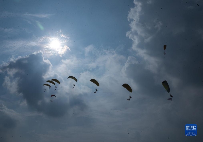 這是8月18日在第十屆沈陽(yáng)法庫(kù)國(guó)際飛行大會(huì)開幕式上拍攝的動(dòng)力傘飛行表演。