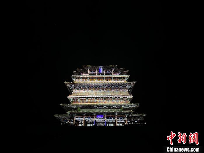 “影片注入獨特地域文化元素,深層表達永濟市精神文化內(nèi)涵。用特效燈光勾勒鸛雀樓整體輪廓,樓體由下而上層層‘旋轉(zhuǎn)’,鸛雀樓自此被‘點亮’?!蓖跣窨〗榻B,傳統(tǒng)與現(xiàn)代相結(jié)合的影片投影在鸛雀樓上,燈火璀璨,流光溢彩,為游客帶來一場震撼的視聽盛宴。