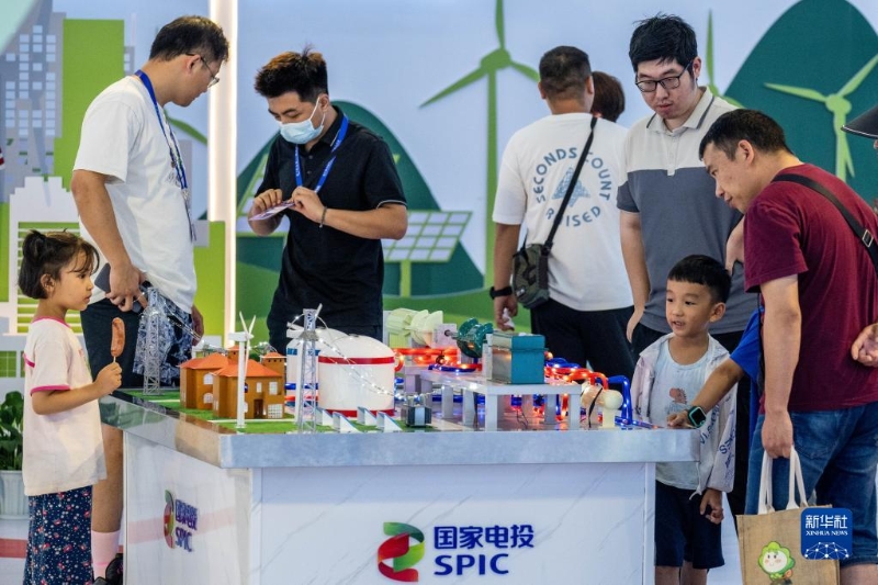 8月19日,在第七屆中國(guó)—南亞博覽會(huì)國(guó)家電投展區(qū),家長(zhǎng)帶著孩子參觀展覽。新華社記者 胡超 攝