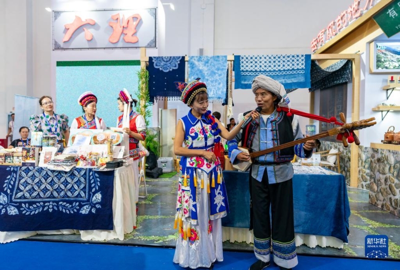 8月16日,劍川白曲國(guó)家級(jí)非遺傳承人姜宗德(右)、省級(jí)非遺傳承人李寶妹在南博會(huì)文化旅游館內(nèi)表演。新華社記者 陳欣波 攝