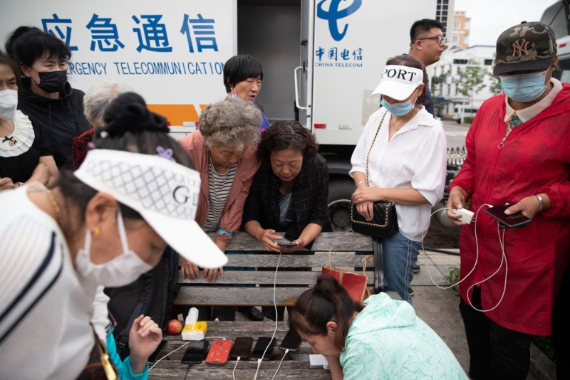 8月6日,人們在黑龍江省海林市長汀鎮(zhèn)一廣場上的應急通信車前與外界通話。新華社記者 張濤 攝