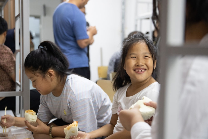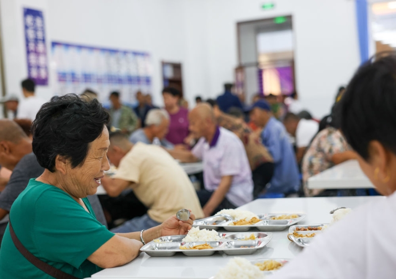 8月11日,居民在吉林省舒蘭市舒蘭三中安置點的食堂吃飯。新華社記者 顏麟蘊 攝