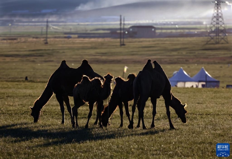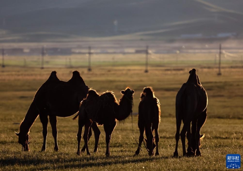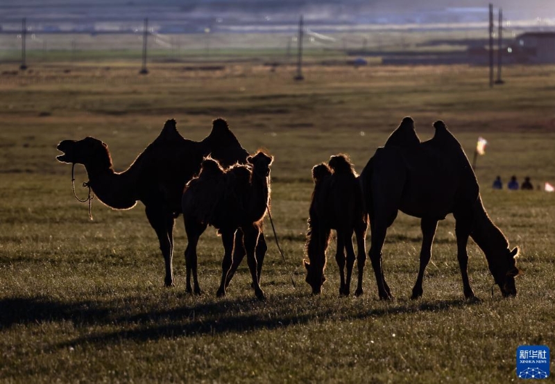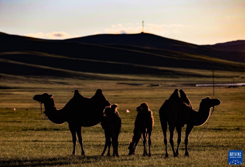 這是8月18日在蒙古國(guó)泰吉山谷拍攝的沐浴在夕陽(yáng)里的駱駝。