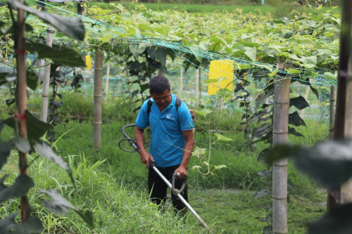 實踐隊伍聚焦“鄉(xiāng)村振興”,深入鄉(xiāng)村開展實地調(diào)研,對往洞鎮(zhèn)的經(jīng)濟發(fā)展狀況及特色產(chǎn)業(yè)的發(fā)展有了深度了解,并就此次調(diào)研中發(fā)現(xiàn)的問題進行分析,提出自己的建議,助力鄉(xiāng)村振興注入青春活力。7月23日,實踐隊伍走近田間地頭,參觀調(diào)研“稻魚鴨”基地和百香果、羅漢果基地。為了體驗果農(nóng)種植的不易,實踐成員用勞動助農(nóng)的方式,幫助當?shù)剞r(nóng)民松土、施肥,用勞動和汗水為鄉(xiāng)村振興貢獻自己的青春力量,讓青春之花在田間地頭綻放!