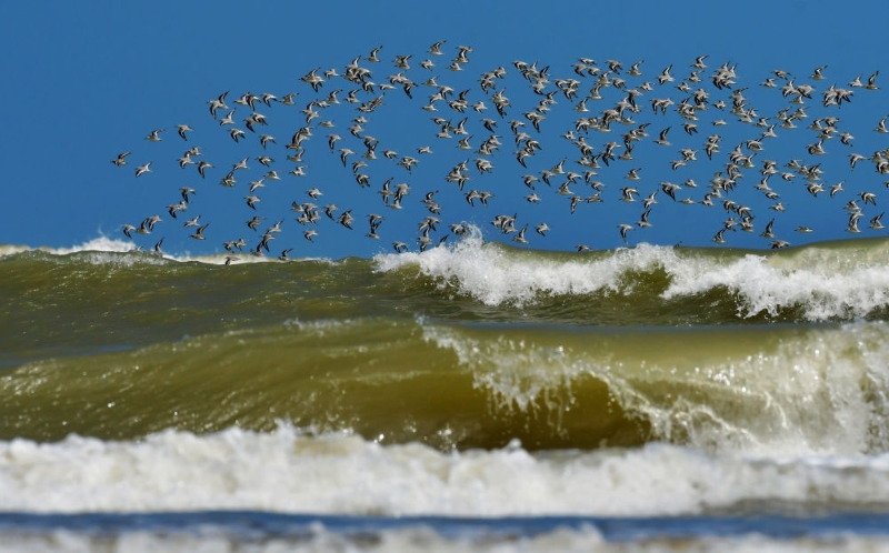 一群鳥飛越閩江河口濕地國家級自然保護區(qū)沙灘(2022年11月13日攝)。新華社記者 魏培全 攝