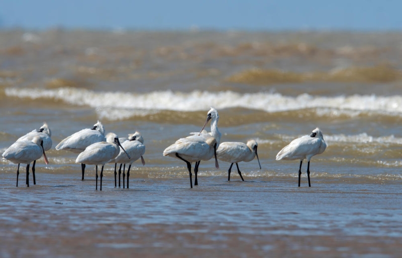 一群黑臉琵鷺在閩江河口濕地海灘上覓食(2023年5月9日攝)。新華社記者 魏培全 攝