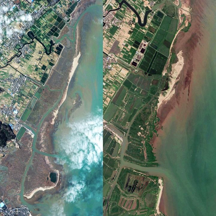 在福建閩江河口濕地國家級自然保護區(qū)管理處,工作人員向記者演示衛(wèi)星遙感照片,多年來閩江河口濕地“人退地進(jìn)”清晰可見:本世紀(jì)初,遍布養(yǎng)殖場和魚塘的畫面呈現(xiàn)大片的黑色,如今綠色連片成面,與藍(lán)色海洋形成美麗畫卷。