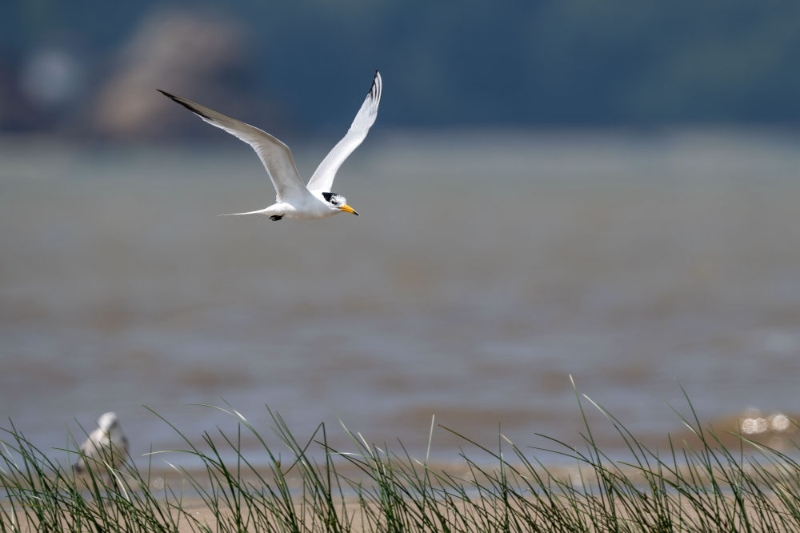 被譽為“神話之鳥”的中華鳳頭燕鷗掠過閩江河口濕地國家級自然保護區(qū)核心區(qū)沙灘(2023年6月25日攝)。新華社記者 魏培全 攝