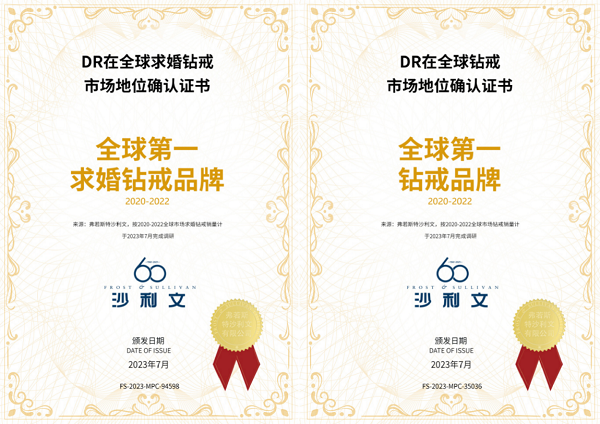 從2020到2022年,DR鉆戒已經(jīng)連續(xù)三年位居全球求婚鉆戒銷量第一。弗若斯特沙利文經(jīng)過全球數(shù)據(jù)調(diào)研,數(shù)據(jù)顯示,DR是“全球第一求婚鉆戒品牌”和“全球第一鉆戒品牌”。業(yè)內(nèi)人士分析稱,DR之所以能夠成為全球第一的求婚鉆戒品牌,主要是憑借其獨特品牌理念、產(chǎn)品硬實力、高坪效旗艦店以及3000萬的真愛粉絲。