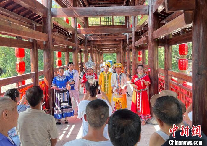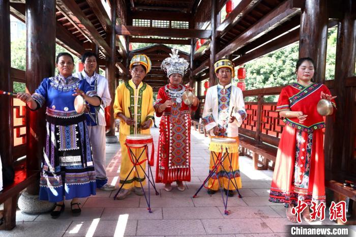 中新網(wǎng)恩施8月21日電 (武一力)“咚鏘、咚鏘、咚咚鏘……”鑼鼓間歇,歌聲即起,近日,一場在湖北省恩施土家族苗族自治州宣恩縣一景區(qū)上演的三棒鼓表演吸引游客駐足圍觀。