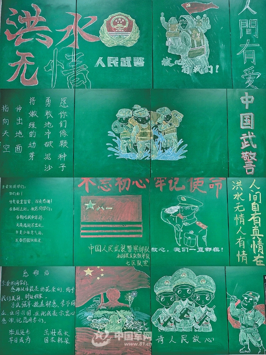 武警北京總隊(duì)機(jī)動(dòng)某支隊(duì)抗洪搶險(xiǎn)期間借宿小學(xué)校舍,歸建之際,通過(guò)黑板報(bào)與小學(xué)生隔空互動(dòng)——