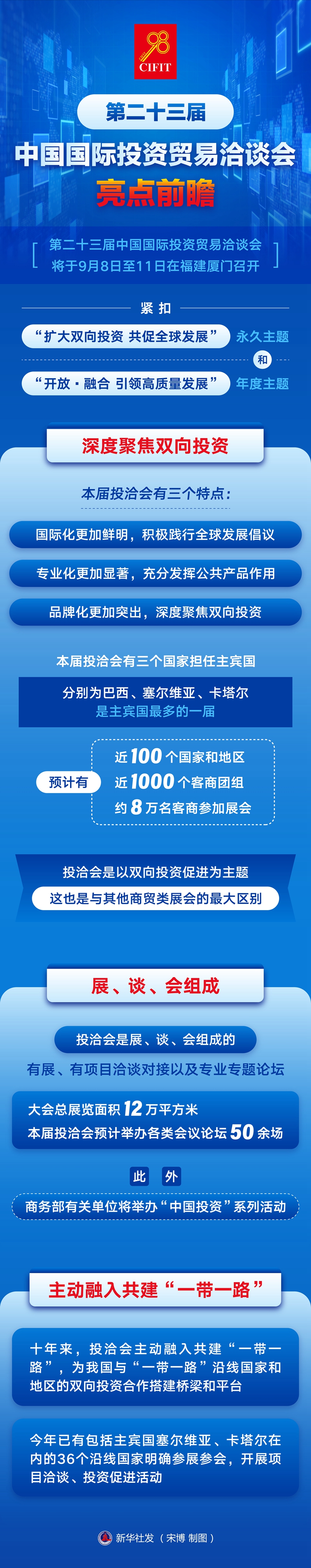 第二十三屆中國國際投資貿(mào)易洽談會將于9月8日至11日在福建廈門召開,緊扣“擴(kuò)大雙向投資 共促全球發(fā)展”永久主題和“開放·融合 引領(lǐng)高質(zhì)量發(fā)展”年度主題。國務(wù)院新聞辦公室8月22日召開新聞發(fā)布會介紹投洽會有關(guān)情況。