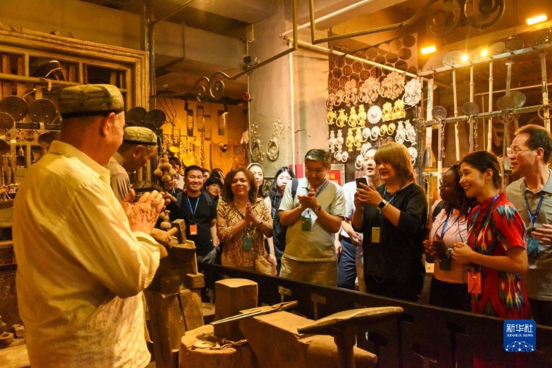 參訪團(tuán)成員參觀新疆喀什古城,點(diǎn)贊手工藝人高超技藝(8月17日攝)。新華社記者 高晗 攝