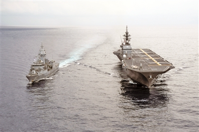 澳大利亞皇家海軍安扎克級護(hù)衛(wèi)艦(左)與日本海上自衛(wèi)隊(duì)出云級直升機(jī)驅(qū)逐艦進(jìn)行聯(lián)合演訓(xùn)。
