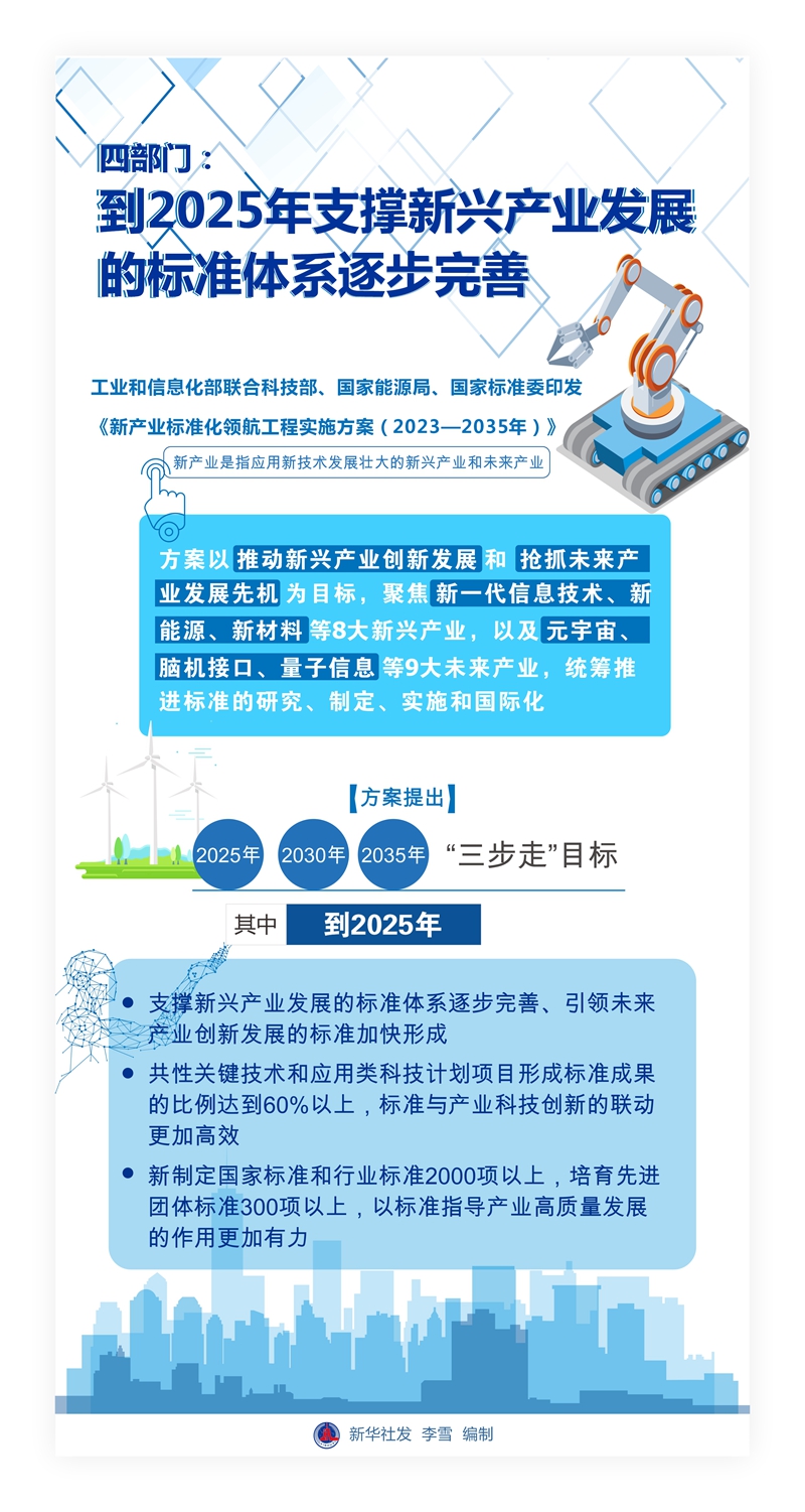 工業(yè)和信息化部有關(guān)負(fù)責(zé)人表示,新產(chǎn)業(yè)是指應(yīng)用新技術(shù)發(fā)展壯大的新興產(chǎn)業(yè)和未來產(chǎn)業(yè)。標(biāo)準(zhǔn)化在推進(jìn)新產(chǎn)業(yè)發(fā)展中發(fā)揮著基礎(chǔ)性、引領(lǐng)性作用。方案以推動新興產(chǎn)業(yè)創(chuàng)新發(fā)展和搶抓未來產(chǎn)業(yè)發(fā)展先機(jī)為目標(biāo),聚焦新一代信息技術(shù)、新能源、新材料等8大新興產(chǎn)業(yè),以及元宇宙、腦機(jī)接口、量子信息等9大未來產(chǎn)業(yè),統(tǒng)籌推進(jìn)標(biāo)準(zhǔn)的研究、制定、實(shí)施和國際化。