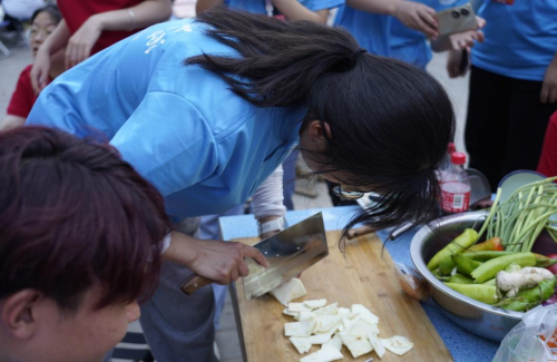 圖為實(shí)踐隊(duì)員在黨校食堂自己切菜準(zhǔn)備做飯