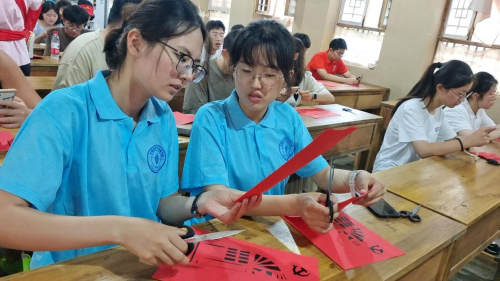 圖為實(shí)踐隊(duì)員延安教育基討論剪紙方法