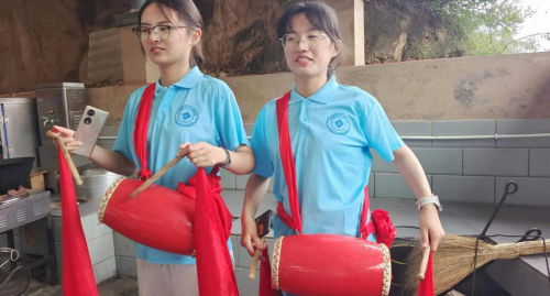 圖為實(shí)踐隊(duì)員在延安教育基地學(xué)習(xí)打腰鼓