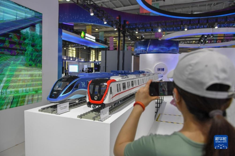 8月23日,在第十四屆中國—東北亞博覽會現(xiàn)場,參觀者拍攝中國中車展出的列車模型。
