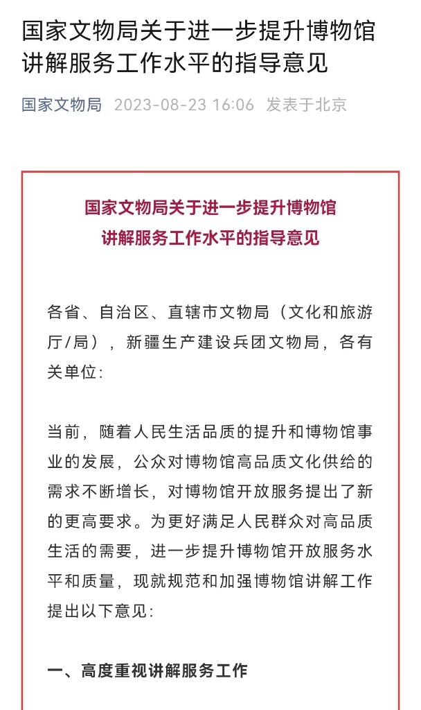 指導(dǎo)意見明確,各級(jí)文物行政主管部門應(yīng)統(tǒng)籌指導(dǎo)所在地區(qū)博物館結(jié)合實(shí)際情況,適度增加固定時(shí)段免費(fèi)人工講解頻次,定期組織博物館館長(zhǎng)、相關(guān)領(lǐng)域?qū)<覍W(xué)者、科研人員或策展團(tuán)隊(duì)開展公益講解活動(dòng),不斷增加優(yōu)質(zhì)講解服務(wù)供給。