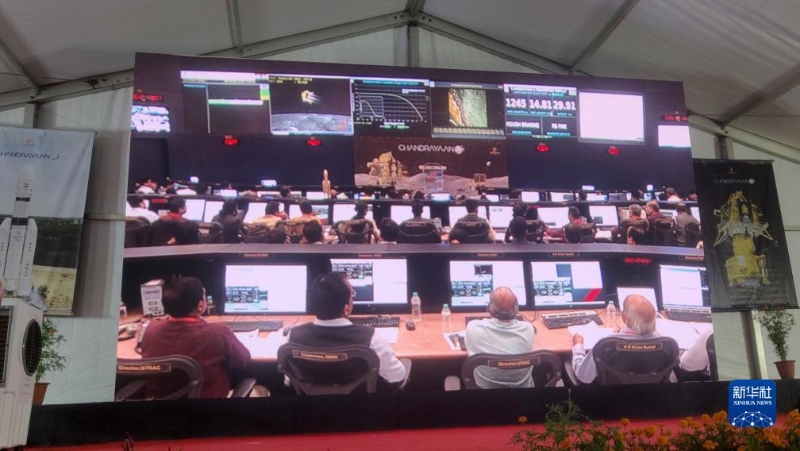 8月23日,在印度班加羅爾,一處大屏幕播放印度月球探測器相關(guān)直播畫面。