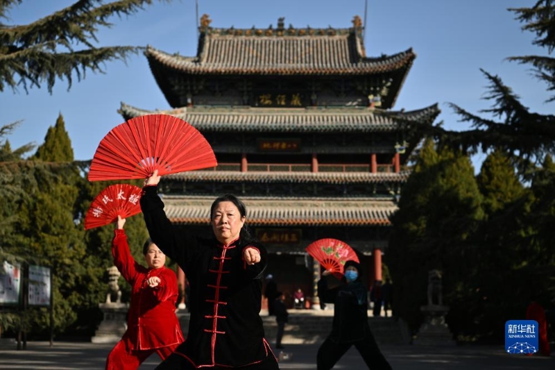 在太原市迎澤區(qū)迎澤公園,市民在練習(xí)太極扇(2023年3月1日攝)。新華社記者 詹彥 攝