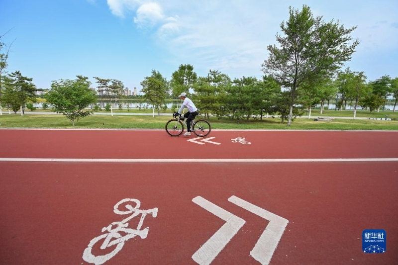 市民在太原市汾河公園內(nèi)騎行(2023年6月27日)。新華社記者 楊晨光 攝