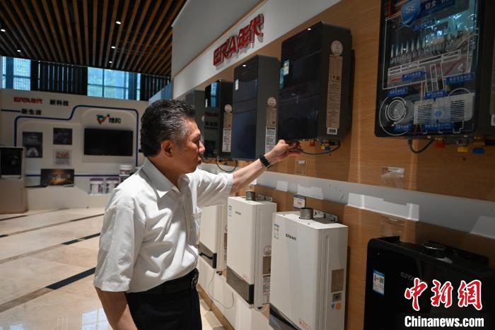 8月15日,黃錦勛向中新社記者介紹廚衛(wèi)的熱水器等產(chǎn)品。張旭 攝