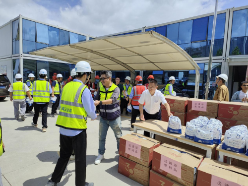 錢翼煒及夏峰海向高溫下依然堅守崗位的建筑工人們道辛苦、說感謝、送關(guān)懷,并送上高溫清涼慰問品。對他們不畏酷暑、依然堅持奮戰(zhàn)在一線的敬業(yè)給予高度肯定,感謝他們長期以來為項目發(fā)展作出的貢獻(xiàn),并叮囑大家在炎熱的天氣里要注意防暑降溫,合理安排作息,加強(qiáng)自我防護(hù),注意勞逸結(jié)合,做好防暑降溫各項措施,以更飽滿的精神狀態(tài)投入到安全生產(chǎn)工作中去。
