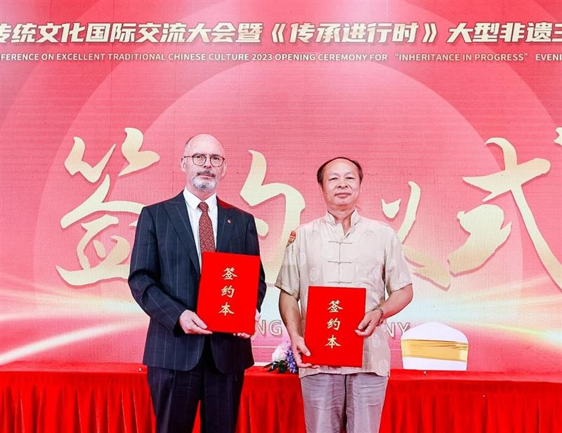 在中國傳統(tǒng)文化國際交流會上,來自阿爾巴尼亞駐華大使塞利姆?貝洛爾塔亞先生與中國非物質(zhì)文化遺產(chǎn)濁酒?古液春代表劉淦芳先生進行簽署收藏合約。帶回駐華大使館和他們國家博物館進行收藏。本次收藏簽約,不僅在渠道上拓展了非遺文化的傳播路徑,也促使非遺傳承實現(xiàn)規(guī)模經(jīng)濟和商業(yè)變現(xiàn)價值,繼而擴大其美譽度和影響力。