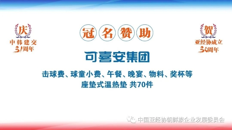 本次活動由可喜安集團冠名贊助,高爾夫尊(中國)和韓商會知名韓國企業(yè)提供球服、禮品、圈里圈外集團提供晚宴用酒、北京北湖九號高爾夫俱樂部為比賽場地提供便利條件。