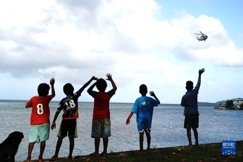 8月24日,中國(guó)海軍“和平方舟”號(hào)醫(yī)院船醫(yī)療分隊(duì)搭乘艦載醫(yī)療救護(hù)直升機(jī)前往所羅門群島圖拉吉島巡診,島上的孩子們揮手致意。新華社發(fā)(徐小龍 攝)