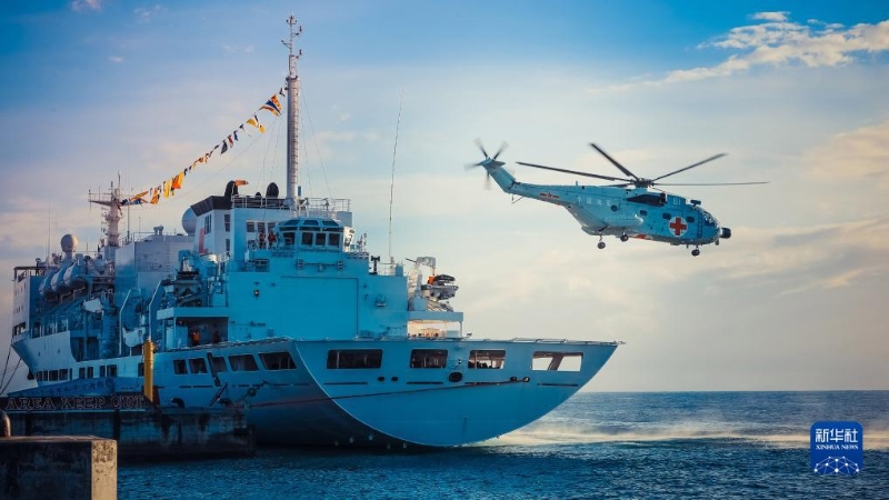 8月24日,中國(guó)海軍“和平方舟”號(hào)醫(yī)院船靠泊所羅門群島霍尼亞拉港期間,艦載醫(yī)療救護(hù)直升機(jī)赴外島開展巡診服務(wù)。新華社發(fā)(黎宇 攝)