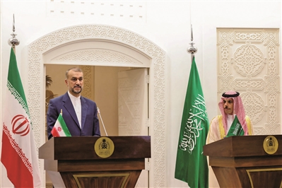 伊朗外交部長阿卜杜拉希揚(左)與沙特外交大臣費薩爾(右)舉行聯(lián)合新聞發(fā)布會。