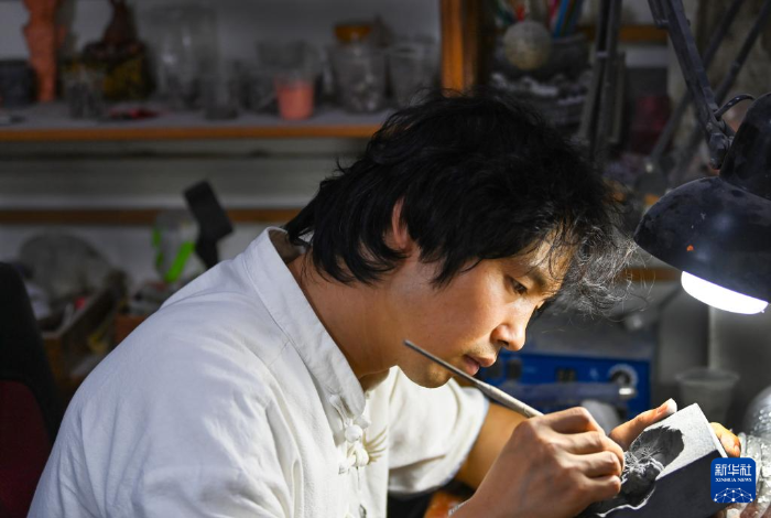 倪朋輝在工作室精心創(chuàng)作磚雕作品(8月25日攝)。新華社發(fā)(張嵐 攝)