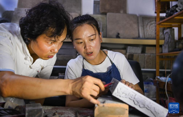 倪朋輝與妻子陳芳在工作室一起探討磚雕創(chuàng)作構(gòu)思(8月25日攝)。新華社發(fā)(張嵐 攝)