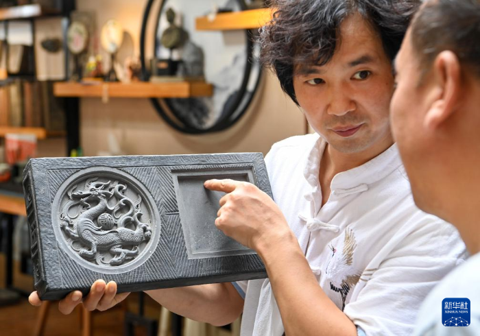 倪朋輝(左)向來賓展示“東方蒼龍”磚雕作品(8月25日攝)。新華社發(fā)(張嵐 攝)