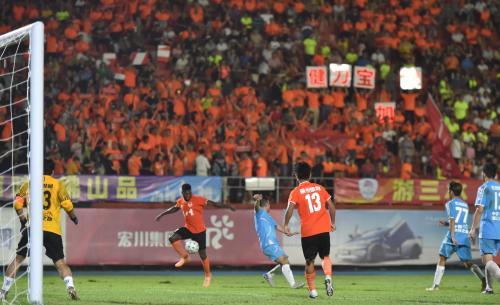 一個激情四溢的口號在全場響起:“健力寶為三水西甲加油!”——猶如一股熱浪,席卷全場,全場的氣氛被調(diào)動起來,吶喊聲此起彼伏。