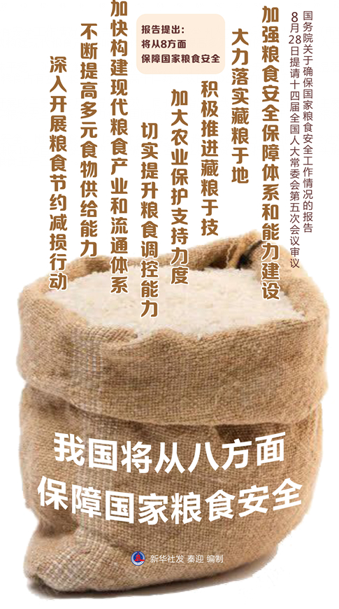 新華社北京8月28日電(記者嚴(yán)賦憬、郁瓊源)國(guó)務(wù)院關(guān)于確保國(guó)家糧食安全工作情況的報(bào)告28日提請(qǐng)十四屆全國(guó)人大常委會(huì)第五次會(huì)議審議。報(bào)告提出,將從加強(qiáng)糧食安全保障體系和能力建設(shè)、大力落實(shí)藏糧于地、積極推進(jìn)藏糧于技、加大農(nóng)業(yè)保護(hù)支持力度、切實(shí)提升糧食調(diào)控能力、加快構(gòu)建現(xiàn)代糧食產(chǎn)業(yè)和流通體系、不斷提高多元食物供給能力、深入開(kāi)展糧食節(jié)約減損行動(dòng)等8方面保障國(guó)家糧食安全。